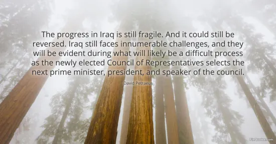 Petraeus, David. "The progress in Iraq is still fragile. And it could still be reversed. Iraq still faces innumerable challenges, and they will be evident during what will likely be a difficult process as the newly elected Council of Representatives selects the next prime minister, president, and speaker of the council." FixQuotes. January 15, 2026. https://fixquotes.com/quotes/the-progress-in-iraq-is-still-fragile-and-it-161938/.