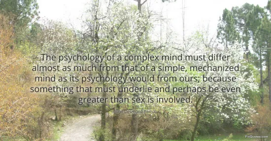 Bernal, John Desmond. (2026, January 17). The psychology of a complex mind must differ almost as much from that of a simple, mechanized mind as its psychology would from ours; because something that must underlie and perhaps be even greater than sex is involved. FixQuotes. https://fixquotes.com/quotes/the-psychology-of-a-complex-mind-must-differ-47107/