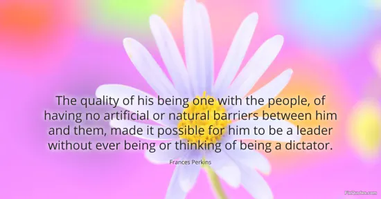 Perkins, Frances. "The quality of his being one with the people, of having no artificial or natural barriers between him and them, made it possible for him to be a leader without ever being or thinking of being a dictator." FixQuotes. January 17, 2026. https://fixquotes.com/quotes/the-quality-of-his-being-one-with-the-people-of-54179/.