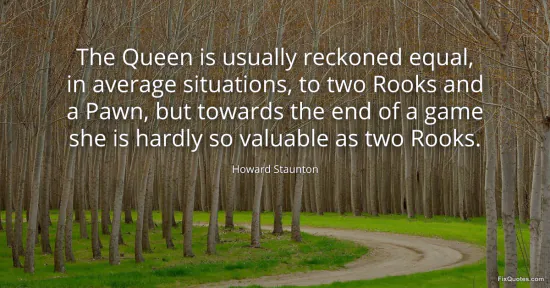 Staunton, Howard. (2026, January 18). The Queen is usually reckoned equal, in average situations, to two Rooks and a Pawn, but towards the end of a game she is hardly so valuable as two Rooks. FixQuotes. https://fixquotes.com/quotes/the-queen-is-usually-reckoned-equal-in-average-12018/