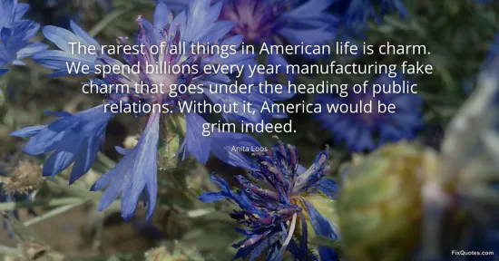 Loos, Anita. (2026, January 17). The rarest of all things in American life is charm. We spend billions every year manufacturing fake charm that goes under the heading of public relations. Without it, America would be grim indeed. FixQuotes. https://fixquotes.com/quotes/the-rarest-of-all-things-in-american-life-is-41071/