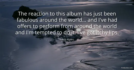 Alpert, Herb. "The reaction to this album has just been fabulous around the world... and I've had offers to perform from around the world and I'm tempted to do it. I've got itchy lips." FixQuotes. January 16, 2026. https://fixquotes.com/quotes/the-reaction-to-this-album-has-just-been-fabulous-105657/.