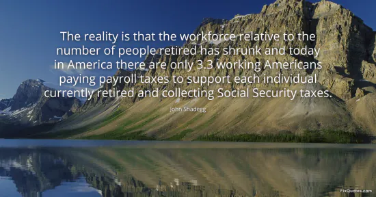 Shadegg, John. (2026, January 15). The reality is that the workforce relative to the number of people retired has shrunk and today in America there are only 3.3 working Americans paying payroll taxes to support each individual currently retired and collecting Social Security taxes. FixQuotes. https://fixquotes.com/quotes/the-reality-is-that-the-workforce-relative-to-the-151667/