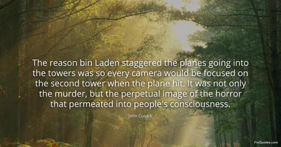 Cusack, John. (2026, January 15). The reason bin Laden staggered the planes going into the towers was so every camera would be focused on the second tower when the plane hit. It was not only the murder, but the perpetual image of the horror that permeated into people's consciousness. FixQuotes. https://fixquotes.com/quotes/the-reason-bin-laden-staggered-the-planes-going-151782/