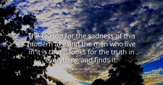 Goncourt, Edmond De. (2026, January 17). The reason for the sadness of this modern age and the men who live in it is that it looks for the truth in everything and finds it. FixQuotes. https://fixquotes.com/quotes/the-reason-for-the-sadness-of-this-modern-age-and-47087/