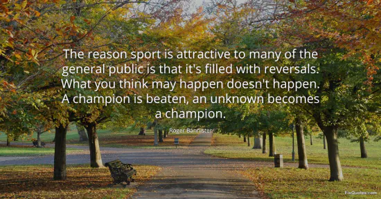 Bannister, Roger. (2026, January 16). The reason sport is attractive to many of the general public is that it's filled with reversals. What you think may happen doesn't happen. A champion is beaten, an unknown becomes a champion. FixQuotes. https://fixquotes.com/quotes/the-reason-sport-is-attractive-to-many-of-the-83645/
