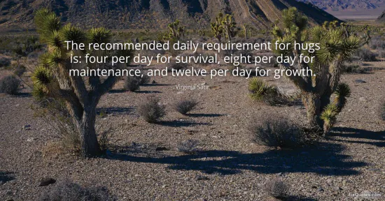 Satir, Virginia. "The recommended daily requirement for hugs is: four per day for survival, eight per day for maintenance, and twelve per day for growth." FixQuotes. January 15, 2026. https://fixquotes.com/quotes/the-recommended-daily-requirement-for-hugs-is-2955/.