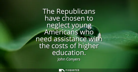 John Conyers levels a moral and policy charge: that Republican leaders have opted not merely to disagree over tactics but to abandon a generational obligation. The phrasing chosen to neglect assigns agency and values to a budget choice, casting college affordability as a test of national priorities rather than a technical dispute about numbers. It ties the fortunes of young Americans to deliberate decisions in Congress and implies that inaction or retrenchment is itself a choice with consequences.