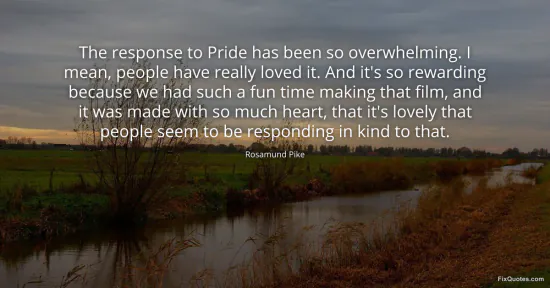Pike, Rosamund. (2026, January 16). The response to Pride has been so overwhelming. I mean, people have really loved it. And it's so rewarding because we had such a fun time making that film, and it was made with so much heart, that it's lovely that people seem to be responding in kind to that. FixQuotes. https://fixquotes.com/quotes/the-response-to-pride-has-been-so-overwhelming-i-83653/