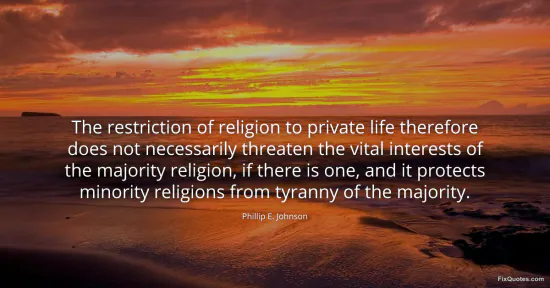 Johnson, Phillip E. "The restriction of religion to private life therefore does not necessarily threaten the vital interests of the majority religion, if there is one, and it protects minority religions from tyranny of the majority." FixQuotes. January 17, 2026. https://fixquotes.com/quotes/the-restriction-of-religion-to-private-life-80620/.