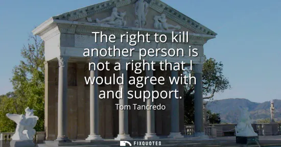 Tom Tancredo, a Colorado Republican and former congressman known for hardline positions and a 2008 presidential run, often ties policy to uncompromising moral premises. Here he aligns with a broader pro-life and socially conservative tradition that treats human life as intrinsically inviolable from conception to natural death. The phrasing echoes debates over abortion and physician-assisted suicide, where supporters speak in terms of autonomy and choice and opponents translate those claims into a right to kill. Rhetorically, it shifts the moral burden: rather than justifying restrictions, he demands that defenders of permissive policies justify the existence of a right to take life.