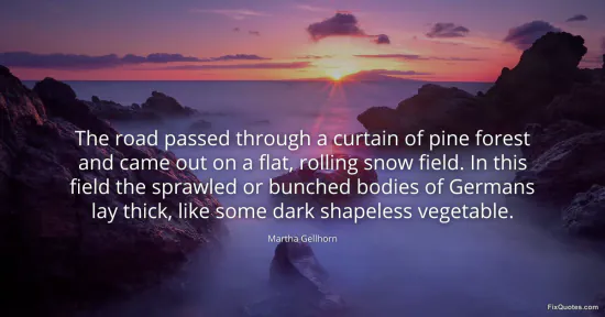 Gellhorn, Martha. (2026, January 15). The road passed through a curtain of pine forest and came out on a flat, rolling snow field. In this field the sprawled or bunched bodies of Germans lay thick, like some dark shapeless vegetable. FixQuotes. https://fixquotes.com/quotes/the-road-passed-through-a-curtain-of-pine-forest-152359/