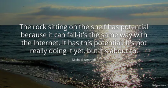 Nesmith, Michael. "The rock sitting on the shelf has potential because it can fall-it's the same way with the Internet. It has this potential. It's not really doing it yet, but it's about to." FixQuotes. January 16, 2026. https://fixquotes.com/quotes/the-rock-sitting-on-the-shelf-has-potential-130025/.