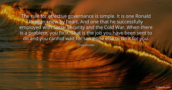 Christie, Chris. (2026, January 17). The rule for effective governance is simple. It is one Ronald Reagan knew by heart. And one that he successfully employed with Social Security and the Cold War. When there is a problem, you fix it. That is the job you have been sent to do and you cannot wait for someone else to do it for you. FixQuotes. https://fixquotes.com/quotes/the-rule-for-effective-governance-is-simple-it-is-73490/