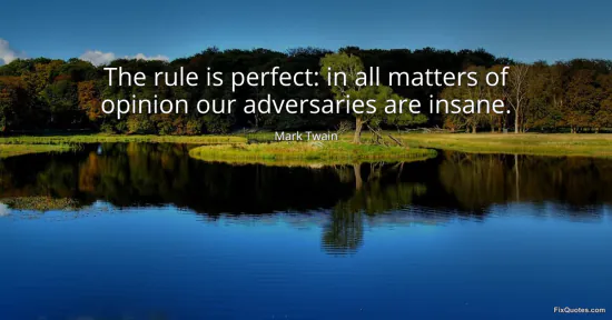 Twain, Mark. (2026, February 28). The rule is perfect: in all matters of opinion our adversaries are insane. FixQuotes. https://fixquotes.com/quotes/the-rule-is-perfect-in-all-matters-of-opinion-our-22255/