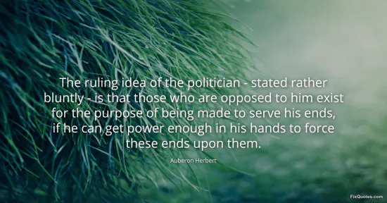 Herbert, Auberon. "The ruling idea of the politician - stated rather bluntly - is that those who are opposed to him exist for the purpose of being made to serve his ends, if he can get power enough in his hands to force these ends upon them." FixQuotes. January 16, 2026. https://fixquotes.com/quotes/the-ruling-idea-of-the-politician-stated-rather-138704/.