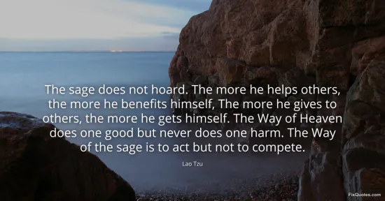 "The sage does not hoard. The more he helps others, the more he benefits himself, The more he gives to others, the more he gets himself. The Way of Heaven does one good but never does one harm. The Way of the sage is to act but not to compete." FixQuotes, 17 Jan. 2026, https://fixquotes.com/quotes/the-sage-does-not-hoard-the-more-he-helps-others-28422/. Accessed 11 Feb. 2026.