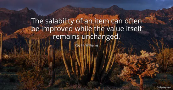 Williams, Roy H. "The salability of an item can often be improved while the value itself remains unchanged." FixQuotes. January 17, 2026. https://fixquotes.com/quotes/the-salability-of-an-item-can-often-be-improved-75531/.