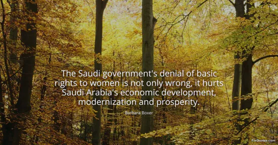 Boxer, Barbara. (2026, January 17). The Saudi government's denial of basic rights to women is not only wrong, it hurts Saudi Arabia's economic development, modernization and prosperity. FixQuotes. https://fixquotes.com/quotes/the-saudi-governments-denial-of-basic-rights-to-43125/
