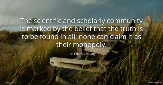 Polanyi, John Charles. (2026, January 15). The scientific and scholarly community is marked by the belief that the truth is to be found in all; none can claim it as their monopoly. FixQuotes. https://fixquotes.com/quotes/the-scientific-and-scholarly-community-is-marked-151581/