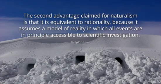 Johnson, Phillip E. "The second advantage claimed for naturalism is that it is equivalent to rationality, because it assumes a model of reality in which all events are in principle accessible to scientific investigation." FixQuotes. January 17, 2026. https://fixquotes.com/quotes/the-second-advantage-claimed-for-naturalism-is-77479/.