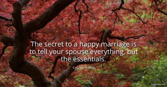 Nelms, Cynthia. "The secret to a happy marriage is to tell your spouse everything, but the essentials." FixQuotes. January 16, 2026. https://fixquotes.com/quotes/the-secret-to-a-happy-marriage-is-to-tell-your-132175/.