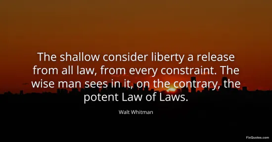 Whitman, Walt. (2026, January 17). The shallow consider liberty a release from all law, from every constraint. The wise man sees in it, on the contrary, the potent Law of Laws. FixQuotes. https://fixquotes.com/quotes/the-shallow-consider-liberty-a-release-from-all-29001/