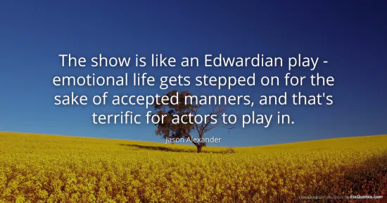 Alexander, Jason. (2026, January 16). The show is like an Edwardian play - emotional life gets stepped on for the sake of accepted manners, and that's terrific for actors to play in. FixQuotes. https://fixquotes.com/quotes/the-show-is-like-an-edwardian-play-emotional-112765/