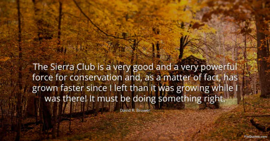 Brower, David R. "The Sierra Club is a very good and a very powerful force for conservation and, as a matter of fact, has grown faster since I left than it was growing while I was there! It must be doing something right." FixQuotes. January 17, 2026. https://fixquotes.com/quotes/the-sierra-club-is-a-very-good-and-a-very-24498/.