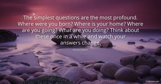 Bach, Richard. "The simplest questions are the most profound. Where were you born? Where is your home? Where are you going? What are you doing? Think about these once in a while and watch your answers change." FixQuotes. January 14, 2026. https://fixquotes.com/quotes/the-simplest-questions-are-the-most-profound-9942/.