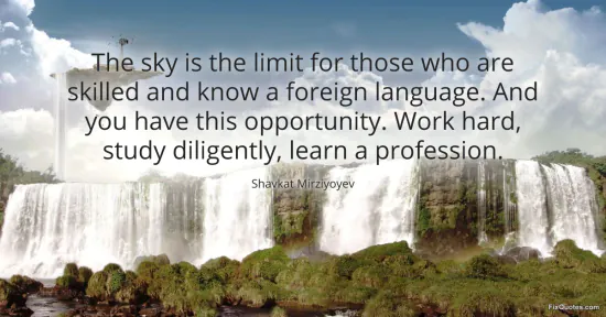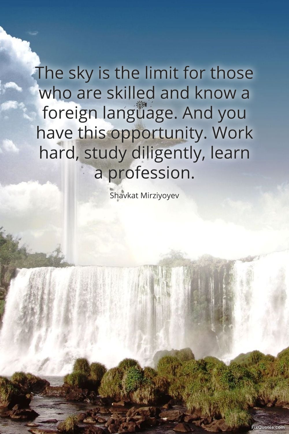 Mirziyoyev, Shavkat. (2026, March 7). The sky is the limit for those who are skilled and know a foreign language. And you have this opportunity. Work hard, study diligently, learn a profession. FixQuotes. https://fixquotes.com/quotes/the-sky-is-the-limit-for-those-who-are-skilled-185724/
