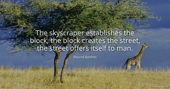 Barthes makes the city sound like a sentence that writes its readers. The skyscraper, the block, the street: three units stacked like grammar, each one generating the next, until the final clause lands on its supposed beneficiary, "man". The cadence matters. It isn’t a neutral description of urban form so much as a map of power that pretends to be natural. A skyscraper does not merely sit on a block; it "establishes" it, as if corporate capital and modern planning get to define what counts as a block in the first place. The block then "creates" the street, flipping the romantic idea that streets are organic public commons. Here, the street is an outcome, a designed product.