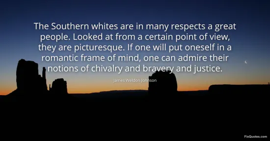 Johnson, James Weldon. (2026, January 16). The Southern whites are in many respects a great people. Looked at from a certain point of view, they are picturesque. If one will put oneself in a romantic frame of mind, one can admire their notions of chivalry and bravery and justice. FixQuotes. https://fixquotes.com/quotes/the-southern-whites-are-in-many-respects-a-great-109003/