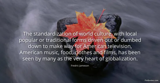 Jameson, Fredric. (2026, January 14). The standardization of world culture, with local popular or traditional forms driven out or dumbed down to make way for American television, American music, food, clothes and films, has been seen by many as the very heart of globalization. FixQuotes. https://fixquotes.com/quotes/the-standardization-of-world-culture-with-local-101180/