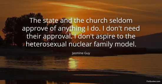 Guy, Jasmine. "The state and the church seldom approve of anything I do. I don't need their approval. I don't aspire to the heterosexual nuclear family model." FixQuotes. January 17, 2026. https://fixquotes.com/quotes/the-state-and-the-church-seldom-approve-of-63570/.