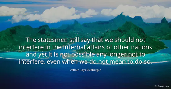 Sulzberger, Arthur Hays. "The statesmen still say that we should not interfere in the internal affairs of other nations and yet it is not possible any longer not to interfere, even when we do not mean to do so." FixQuotes. January 15, 2026. https://fixquotes.com/quotes/the-statesmen-still-say-that-we-should-not-8968/.