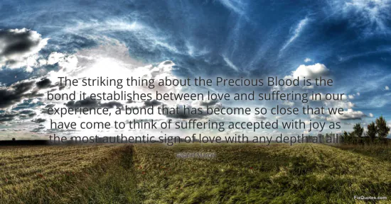 "The striking thing about the Precious Blood is the bond it establishes between love and suffering in our experience, a bond that has become so close that we have come to think of suffering accepted with joy as the most authentic sign of love with any depth at all." FixQuotes, 18 Jan. 2026, https://fixquotes.com/quotes/the-striking-thing-about-the-precious-blood-is-2785/. Accessed 12 Feb. 2026.