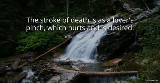 Shakespeare, William. "The stroke of death is as a lover's pinch, which hurts and is desired." FixQuotes. January 15, 2026. https://fixquotes.com/quotes/the-stroke-of-death-is-as-a-lovers-pinch-which-36575/.