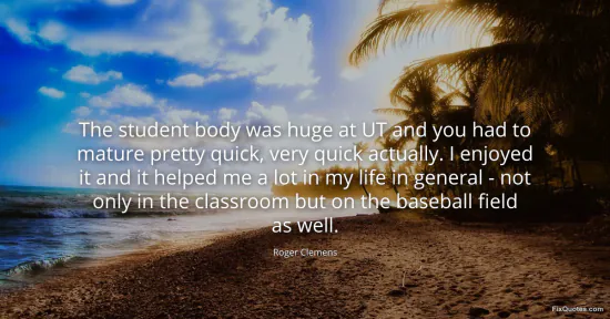 Clemens, Roger. (2026, January 16). The student body was huge at UT and you had to mature pretty quick, very quick actually. I enjoyed it and it helped me a lot in my life in general - not only in the classroom but on the baseball field as well. FixQuotes. https://fixquotes.com/quotes/the-student-body-was-huge-at-ut-and-you-had-to-129185/