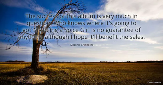 Chisholm, Melanie. (2026, January 16). The success of this album is very much in question. Who knows where it's going to go? My being a Spice Girl is no guarantee of anything, although I hope it'll benefit the sales. FixQuotes. https://fixquotes.com/quotes/the-success-of-this-album-is-very-much-in-84974/