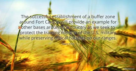 Allard, Wayne. (2026, January 16). The successful establishment of a buffer zone around Fort Carson will provide an example for other bases around the country as we seek to protect the training mission of the U.S. military while preserving critical habitats on our ranges. FixQuotes. https://fixquotes.com/quotes/the-successful-establishment-of-a-buffer-zone-105807/