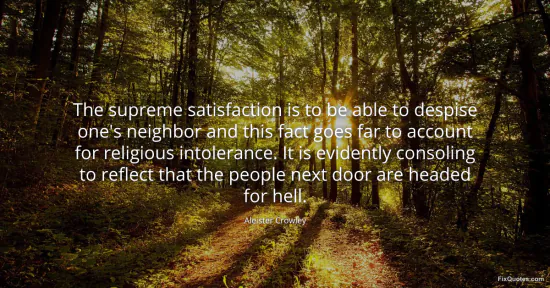 Crowley, Aleister. "The supreme satisfaction is to be able to despise one's neighbor and this fact goes far to account for religious intolerance. It is evidently consoling to reflect that the people next door are headed for hell." FixQuotes. January 15, 2026. https://fixquotes.com/quotes/the-supreme-satisfaction-is-to-be-able-to-despise-34754/.