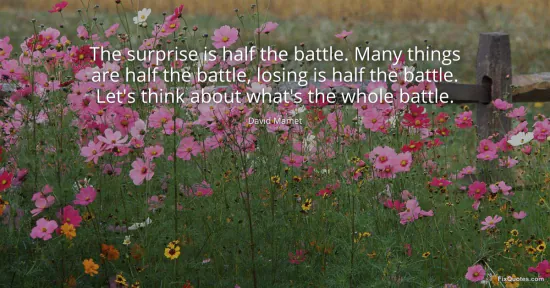 Mamet, David. "The surprise is half the battle. Many things are half the battle, losing is half the battle. Let's think about what's the whole battle." FixQuotes. January 15, 2026. https://fixquotes.com/quotes/the-surprise-is-half-the-battle-many-things-are-10179/.
