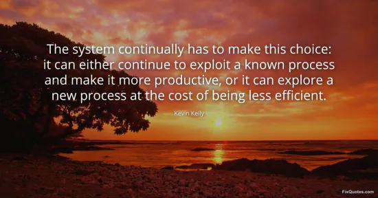 Kelly, Kevin. (2026, January 16). The system continually has to make this choice: it can either continue to exploit a known process and make it more productive, or it can explore a new process at the cost of being less efficient. FixQuotes. https://fixquotes.com/quotes/the-system-continually-has-to-make-this-choice-it-96623/