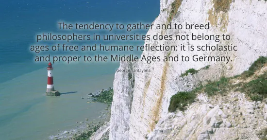 Santayana, George. (2026, January 17). The tendency to gather and to breed philosophers in universities does not belong to ages of free and humane reflection: it is scholastic and proper to the Middle Ages and to Germany. FixQuotes. https://fixquotes.com/quotes/the-tendency-to-gather-and-to-breed-philosophers-33730/