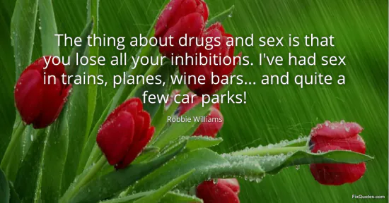 Williams, Robbie. (2026, January 16). The thing about drugs and sex is that you lose all your inhibitions. I've had sex in trains, planes, wine bars... and quite a few car parks! FixQuotes. https://fixquotes.com/quotes/the-thing-about-drugs-and-sex-is-that-you-lose-128995/