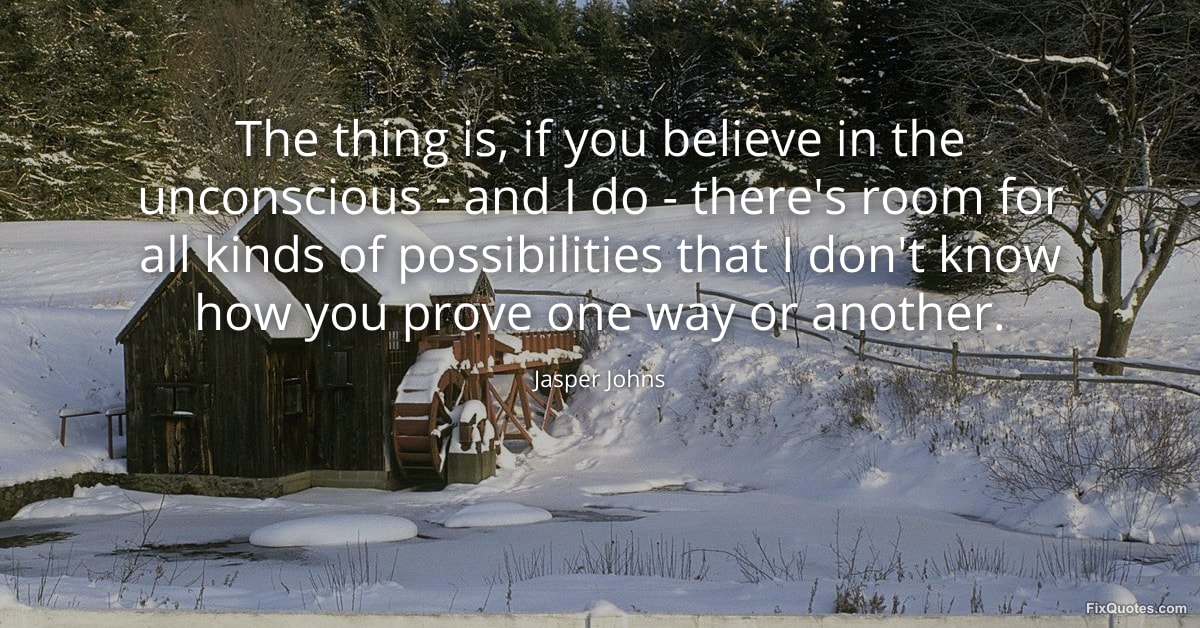 Johns, Jasper. (2026, January 17). The thing is, if you believe in the unconscious - and I do - there's room for all kinds of possibilities that I don't know how you prove one way or another. FixQuotes. https://fixquotes.com/quotes/the-thing-is-if-you-believe-in-the-unconscious-56055/