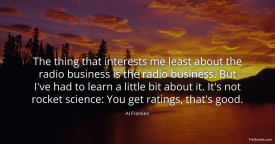 Franken, Al. (2026, January 17). The thing that interests me least about the radio business is the radio business. But I've had to learn a little bit about it. It's not rocket science: You get ratings, that's good. FixQuotes. https://fixquotes.com/quotes/the-thing-that-interests-me-least-about-the-radio-29552/