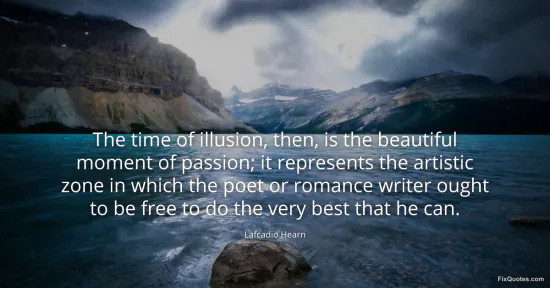 Hearn, Lafcadio. (2026, January 15). The time of illusion, then, is the beautiful moment of passion; it represents the artistic zone in which the poet or romance writer ought to be free to do the very best that he can. FixQuotes. https://fixquotes.com/quotes/the-time-of-illusion-then-is-the-beautiful-moment-147460/
