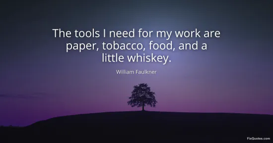 Faulkner, William. "The tools I need for my work are paper, tobacco, food, and a little whiskey." FixQuotes. January 18, 2026. https://fixquotes.com/quotes/the-tools-i-need-for-my-work-are-paper-tobacco-11199/.